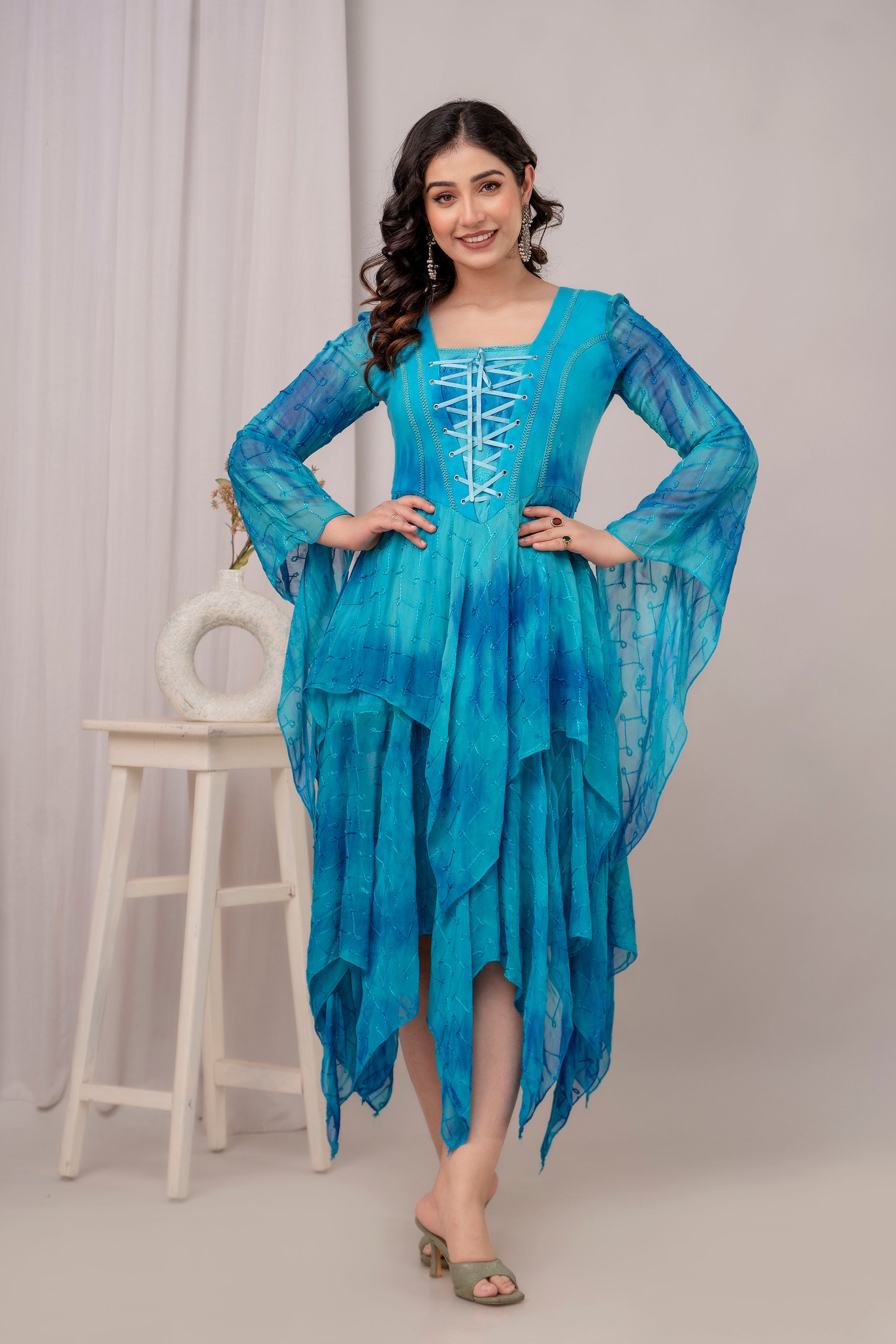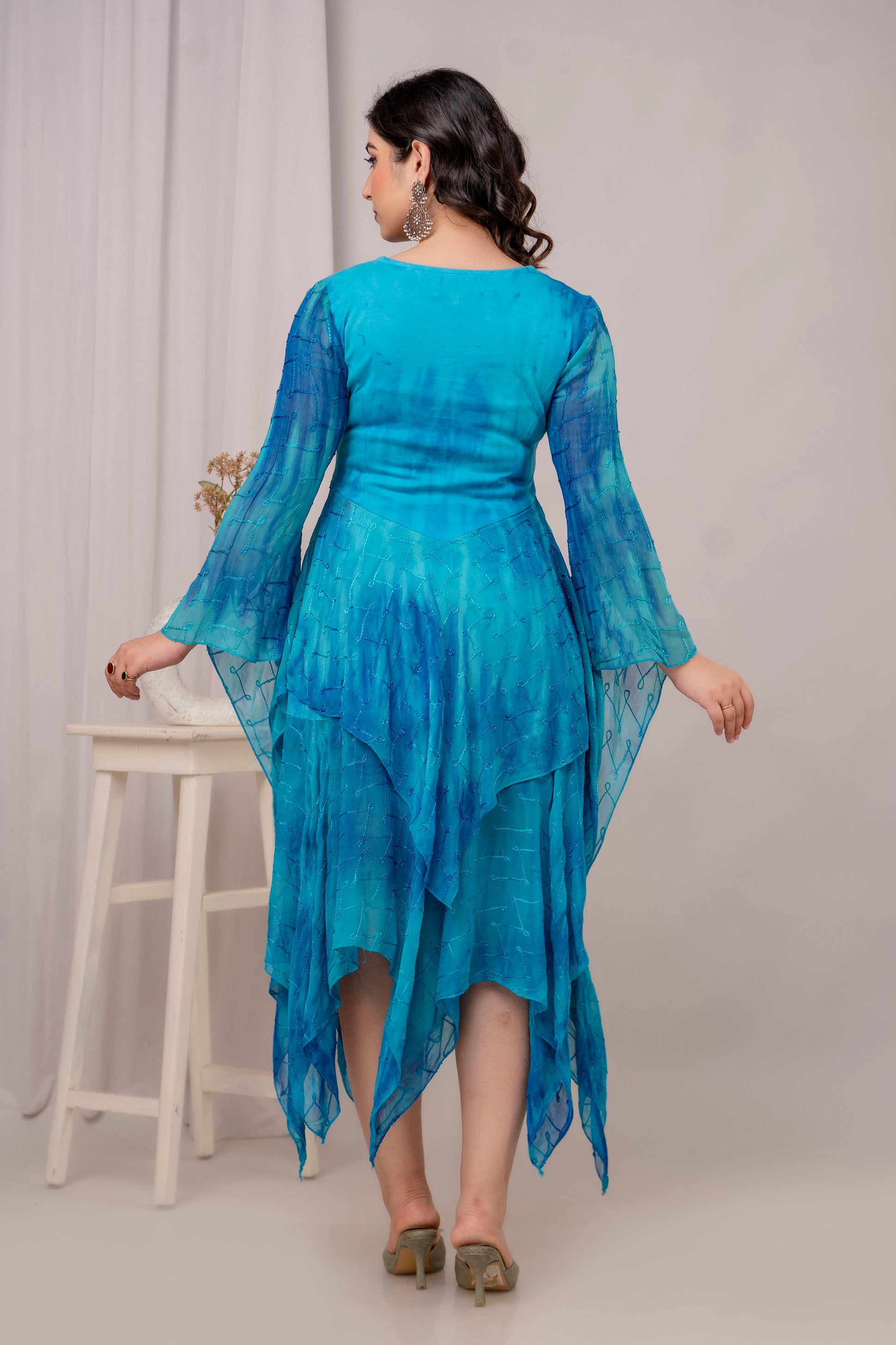 The handkerchief hemline skirt is made of chiffon and is double layered with beautiful effect.