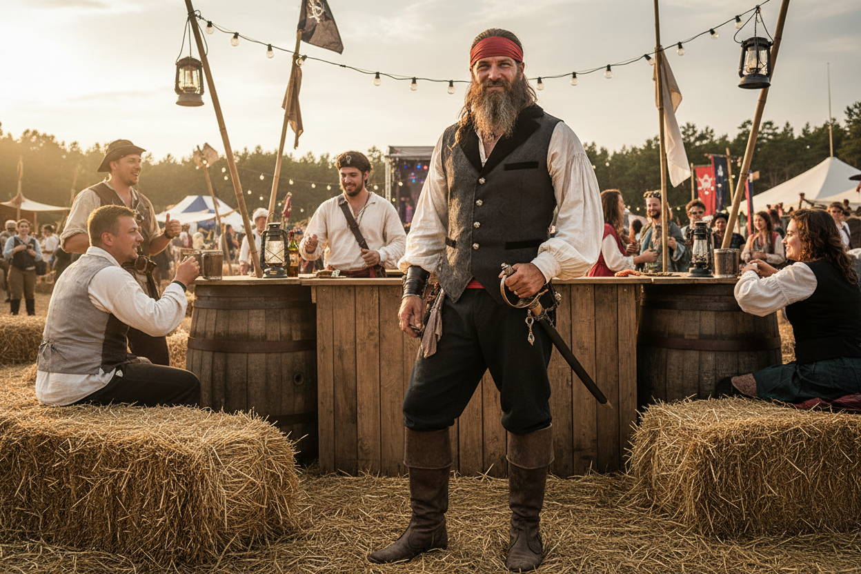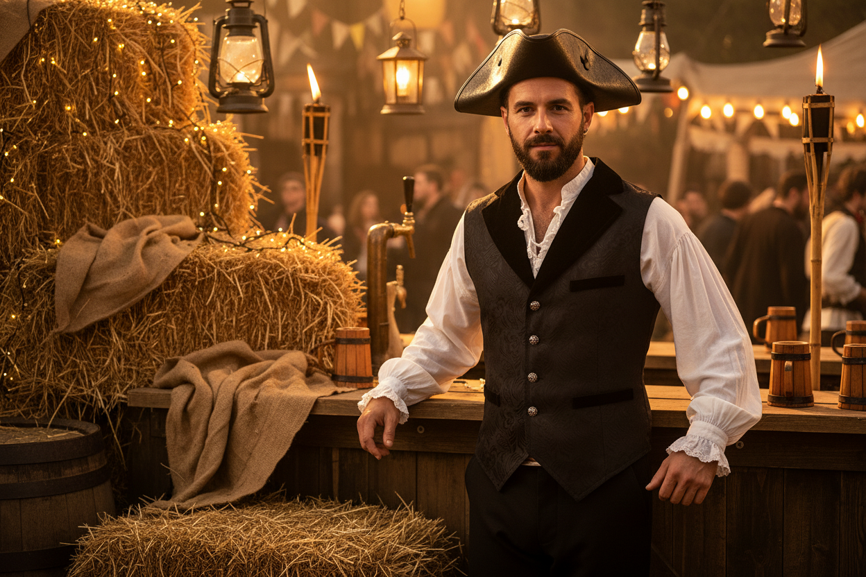 Made from ornate brocade fabric with a subtle sheen and textured pattern, this waistcoat is perfect for captains, corsairs and distinguished rogues. The tailored shape creates a sharp silhouette while remaining comfortable enough for all-day festival wear.