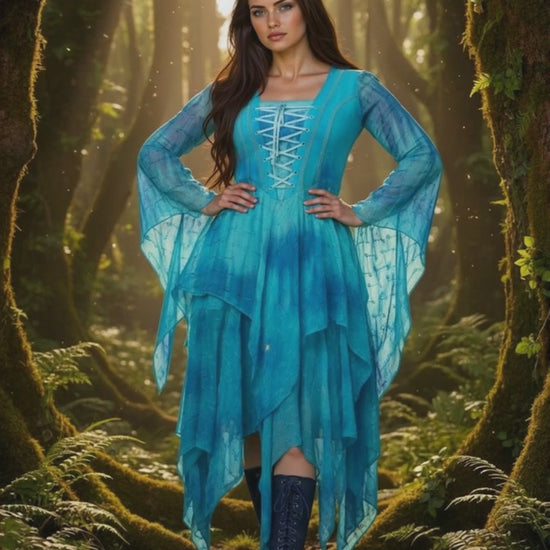 Turquoise Medieval Long Sleeve Lace-Up Chiffon Dress with Handkerchief Hem