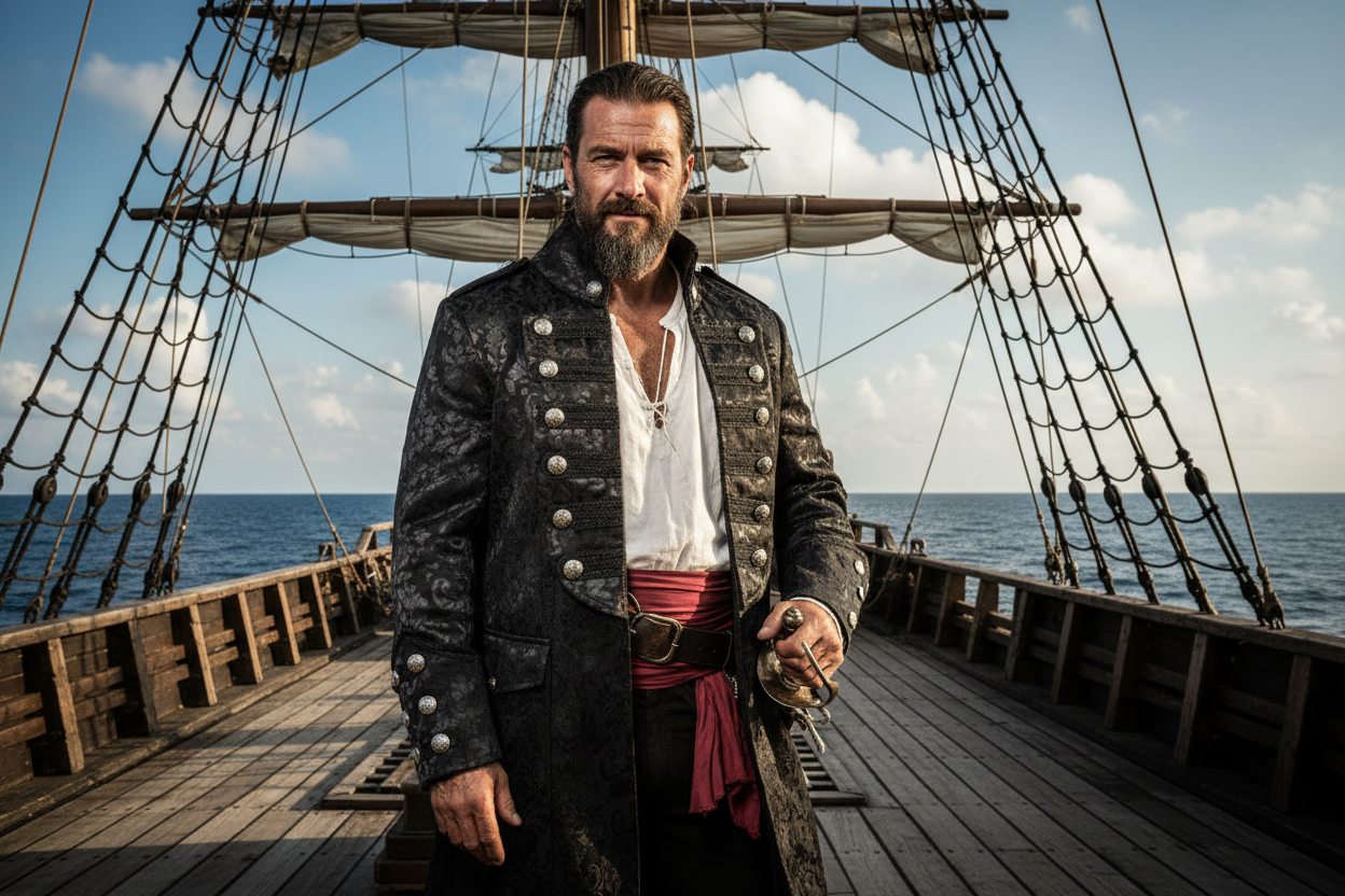 Command attention with this striking Steampunk Pirate Long Coat, crafted from luxurious black jacquard brocade with ornate silver buttons and intricate detailing. The dramatic tailoring and vintage pattern evoke Victorian elegance, while the military-style cuffs and lapels add a bold, adventurous edge — perfect for Steampunk explorers, pirate captains, and LARP heroes alike.